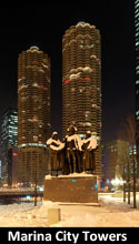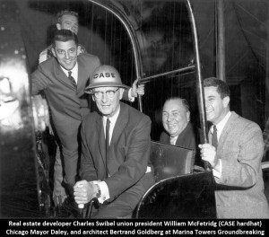 PHOTO RIGHT: Charles Swibel (Developer), William McFetridge (Union president) wearing CASE hardhat and at the controls of a CASE Foundation drill rig, Chicago Mayor Richard Daley, Marina City architect Bertrand Goldberg